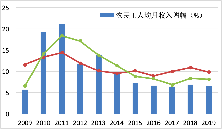農(nóng)民工工資在2010年前后曾有過較快的提高,主要得益于各地最低工資的調(diào)整。值得注意的是,農(nóng)民工工資收入相對增速2015年后開始下降。農(nóng)民工年平均收入2017年是城鎮(zhèn)非私營單位職工平均收入的56%,2019年下降為52.5%。