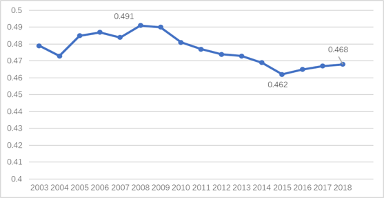 圖1:2003-2018年全國居民收入基尼系數(shù)
