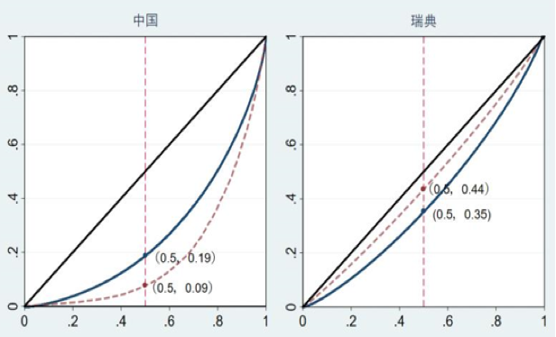 資料來源:中國的曲線根據(jù)CHIPS2018年調(diào)查數(shù)據(jù)計算繪制。瑞典的曲線根據(jù)Nieuwenhuis,Nelson和Alm在2020年發(fā)表論文中2003年的基尼系數(shù)與集中度的數(shù)據(jù)模擬繪制。