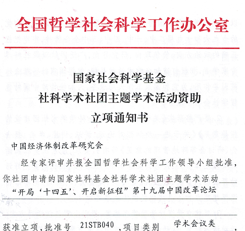 根據(jù)全國(guó)哲學(xué)社會(huì)科學(xué)工作辦公室發(fā)布的“2021年國(guó)家社科基金社科學(xué)術(shù)社團(tuán)主題學(xué)術(shù)活動(dòng)資助名單” ,我會(huì)以 “開局‘十四五’、開啟新征程”為主題的第十九屆中國(guó)改革論壇獲得國(guó)家社科基金立項(xiàng)資助。這是繼今年3月份我會(huì)《推進(jìn)土地、勞動(dòng)力、資本、技術(shù)、數(shù)據(jù)等要素市場(chǎng)化改革研究》課題獲得國(guó)家社科基金重大項(xiàng)目立項(xiàng)后,兩年內(nèi)第四次獲得國(guó)家社科基金資助(獎(jiǎng)勵(lì))。