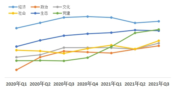 從近幾個季度的評估結(jié)果來看,經(jīng)濟領(lǐng)域熱度值領(lǐng)先其他領(lǐng)域;黨建領(lǐng)域熱度值從2020年第三季度開始穩(wěn)步上升,且增幅高于文化、社會等領(lǐng)域;政治領(lǐng)域改革熱度值從今年一季度以來持續(xù)呈上升趨勢。