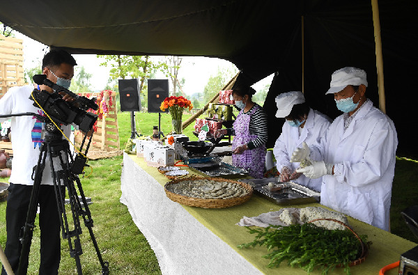 圖為近日安徽省肥西縣柿樹崗鄉(xiāng)村民通過“云上”直播制作當?shù)靥厣朗?。新華社記者 劉軍喜 攝