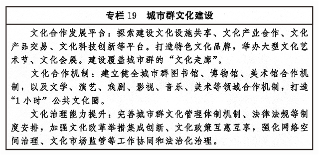 加強(qiáng)區(qū)域文化協(xié)同創(chuàng)新,健全合作互助、扶持補(bǔ)償機(jī)制,推動(dòng)?xùn)|部地區(qū)以創(chuàng)新引領(lǐng)文化發(fā)展,加大力度支持中西部地區(qū)以及東北等老工業(yè)基地文化發(fā)展,扶持革命老區(qū)、民族地區(qū)、邊疆地區(qū)文化發(fā)展,形成相互促進(jìn)、優(yōu)勢互補(bǔ)、融合互動(dòng)的區(qū)域文化發(fā)展格局。圍繞京津冀協(xié)同發(fā)展、長江經(jīng)濟(jì)帶發(fā)展、粵港澳大灣區(qū)建設(shè)、長三角一體化發(fā)展、黃河流域生態(tài)保護(hù)和高質(zhì)量發(fā)展等區(qū)域重大戰(zhàn)略,健全推進(jìn)區(qū)域內(nèi)文化協(xié)同發(fā)展機(jī)制,提升公共文化設(shè)施互聯(lián)互通水平,加強(qiáng)區(qū)域文化產(chǎn)業(yè)帶建設(shè),實(shí)現(xiàn)區(qū)域文化建設(shè)水平整體提高。促進(jìn)形成文化產(chǎn)業(yè)發(fā)展新格局,創(chuàng)新城市群文化一體化發(fā)展體制機(jī)制,共建高水平合作平臺(tái),加強(qiáng)公共文化服務(wù)便利共享。完善以城帶鄉(xiāng)、城鄉(xiāng)融合的文化發(fā)展體制機(jī)制,發(fā)揮城市帶動(dòng)輻射作用,加快城鄉(xiāng)間文化要素雙向流動(dòng),形成以點(diǎn)帶面、特色鮮明、優(yōu)勢互補(bǔ)、均衡配置的城鄉(xiāng)文化發(fā)展新格局。