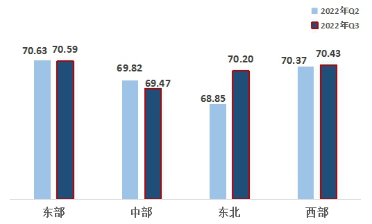 2、從區(qū)域來看,東北、西部地區(qū)均超越中部地區(qū)。東部、西部、東北、中部指數(shù)分別為70.59、70.43、70.20、69.47。區(qū)域熱度指數(shù)呈適當(dāng)?shù)牡赜蛱卣鳎瑬|部地區(qū)第一,西部地區(qū)第二,東北地區(qū)超越中部地區(qū)名列第三,中部地區(qū)最后。東北地區(qū)指數(shù)增幅較大,西部地區(qū)有所增長,東部、中部地區(qū)小幅下滑。