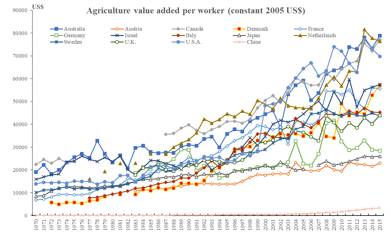 如圖5,西方城市化過程中兩個收入差距的縮小在中國沒有出現(xiàn)。中國在最快速城市化階段出現(xiàn)了城鄉(xiāng)收入差距拉大,第一是我們只有快速城市化,但沒有城鄉(xiāng)融合。第二是我們城市化的模式是回村的城市化模式。在城市里干工作,干到一定程度再回到農(nóng)村,這是全世界沒有的。第三是農(nóng)業(yè)競爭力下降。現(xiàn)在一定要有一個認識,農(nóng)業(yè)的份額降到10%以后,各個國家的農(nóng)業(yè)到底在干什么?我們現(xiàn)在想到農(nóng)業(yè)到10%,再到2%、1%,農(nóng)業(yè)就可有可無了,這種觀點是錯誤的。所有國家的農(nóng)業(yè)在降到10%以后,農(nóng)業(yè)在變強,它的農(nóng)業(yè)和原來的農(nóng)業(yè)完全不一樣。中國由于單向城市化的模式,最后農(nóng)業(yè)競爭力進一步下降。(如圖6)我們現(xiàn)在只有6%、7%的農(nóng)業(yè),這個農(nóng)業(yè)的競爭力是下降的,背后是農(nóng)業(yè)成本上升,所有成本都在上升。