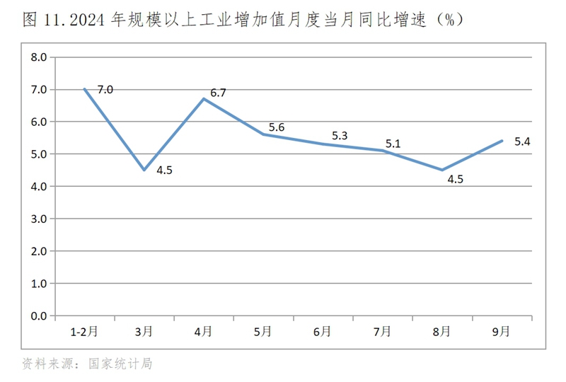 (一)工業(yè)生產(chǎn)增速基本上持續(xù)回落,9月份回升。規(guī)模以上工業(yè)增加值增速年初開局走高,1-2月份同比增長(zhǎng)7.0%,3月份增速回落,4月份增速回升,但自此以后持續(xù)走低,到8月份增速為4.5%,9月份增速呈現(xiàn)回升,同比增長(zhǎng)5.4%。