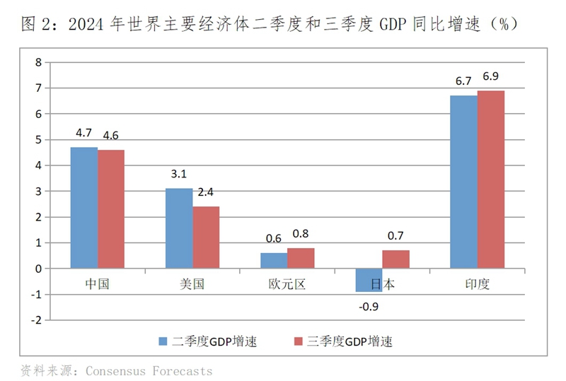 Consensus Forecasts 9月份最新預(yù)測(cè),世界主要經(jīng)濟(jì)體GDP增速有升有落,呈現(xiàn)出走勢(shì)分化的特征。三季度美國(guó)GDP同比增長(zhǎng)2.4%,比二季度增長(zhǎng)3.1%回落0.7個(gè)百分點(diǎn);歐元區(qū)增長(zhǎng)0.8%,比二季度增長(zhǎng)0.6%回升0.2個(gè)百分點(diǎn);日本增長(zhǎng)0.7%,二季度下降0.9%,增速由負(fù)轉(zhuǎn)正;印度增長(zhǎng)6.9%,比二季度增長(zhǎng)6.7%回升0.2個(gè)百分點(diǎn)。