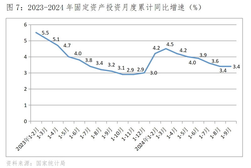 (二)投資增速持續(xù)回落更為明顯,9月份保持穩(wěn)定。1-2月份固定資產(chǎn)投資同比增長(zhǎng)4.2%,1-3月份增速回升到今年以來的最高增速的4.5%,自此以后持續(xù)回落,到8月份回落到3.4%,9月份保持穩(wěn)定,與8月份增速持平。