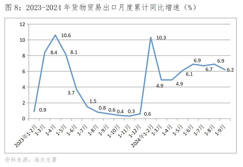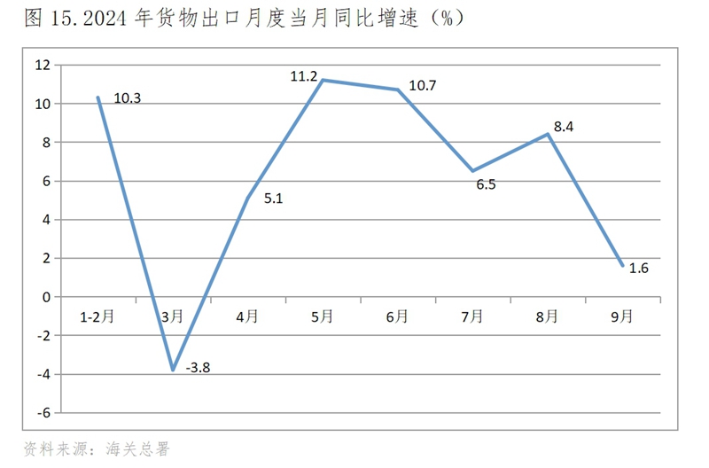 (五)出口增速在較大波動(dòng)中出現(xiàn)放緩,9月份回落。今年以來的出口增速波動(dòng)還不小,1-2月份出口同比增長(zhǎng)10.3%,3月份下降3.8%,隨后保持了兩個(gè)月增速的回升,自6月份增速開始波動(dòng)回落,到9月份回落到增長(zhǎng)1.6%。
