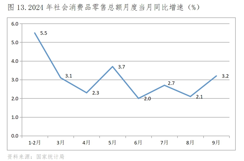 (三)零售增速總體呈現(xiàn)低速波動(dòng)回落,9月份回升。1-2月份社會(huì)消費(fèi)品零售總額同比增長(zhǎng)5.5%,為今年以來的最快增速,3月份回落到增長(zhǎng)3.1%,此后增速在2.0-4.0%區(qū)間內(nèi)低速波動(dòng),9月份增速回升,增長(zhǎng)3.2%。