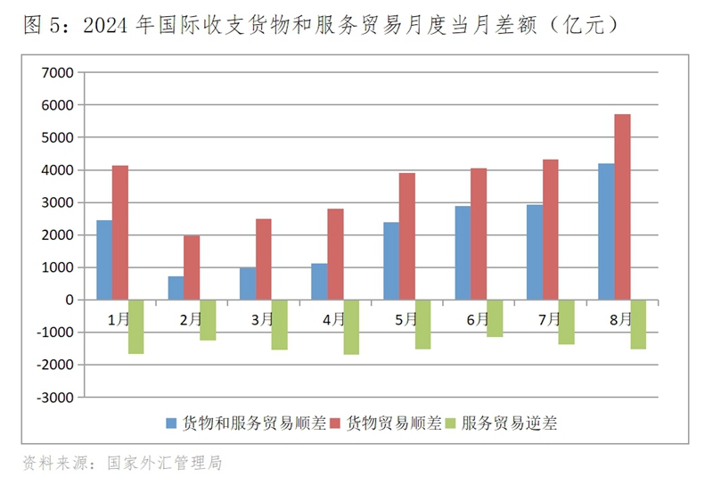 (四)國(guó)際收支貨物和服務(wù)貿(mào)易順差總體逐月增加,貨物貿(mào)易順差的增加是主因。1月份,國(guó)際收支貨物和服務(wù)貿(mào)易順差實(shí)現(xiàn)了高開,達(dá)到了2459億元,2月份回落到724億元,但從2月份開始國(guó)際收支貨物和服務(wù)貿(mào)易順差逐月增加, 8月份達(dá)4203億元,比2月份增加了3479億元。