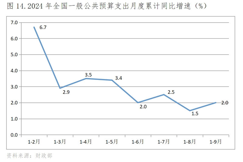 (五)財(cái)政支出增速比上年同期回落。1-9月份一般公共預(yù)算支出同比增長(zhǎng)2.0%,比上年同期增長(zhǎng)3.9%回落1.9個(gè)百分點(diǎn)。其中,支出占比較高的社會(huì)保障和就業(yè)支出同比增長(zhǎng)4.3%,教育支出增長(zhǎng)1.1%,農(nóng)林水支出增長(zhǎng)6.4%,城鄉(xiāng)社區(qū)支出增長(zhǎng)6.1%,住房保障支出增長(zhǎng)2.5%。