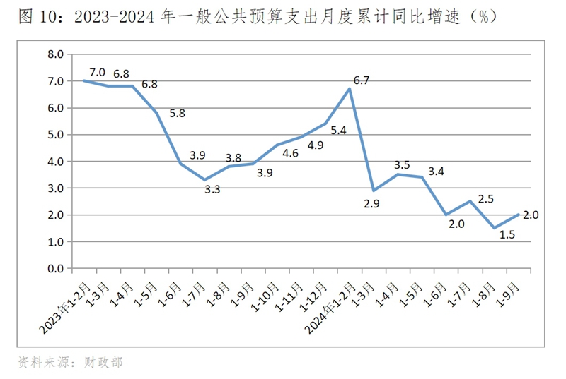(四)財(cái)政支出增速在低速波動(dòng)中走低,9月份略有回升。財(cái)政支出增速年初也是高開,1-2月份財(cái)政支出同比增長(zhǎng)6.7%,1-3月份回落到增長(zhǎng)2.9%,隨后就在低速波動(dòng)中趨勢(shì)性回落,1-9月份增長(zhǎng)2.0%。需要特別指出的是,如果按月度增速計(jì)算的話,財(cái)政支出增速波動(dòng)會(huì)更大一些。