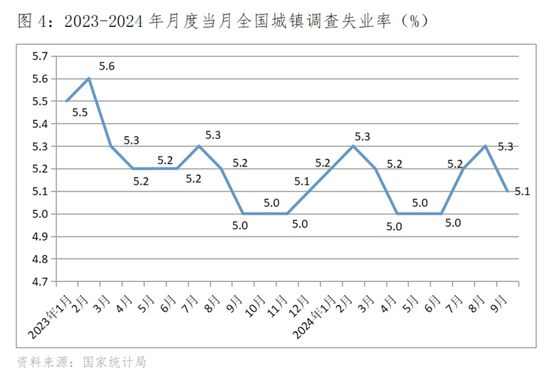 (三)調(diào)查失業(yè)率比上年同期略升,比6月份也略升。9月份城鎮(zhèn)調(diào)查失業(yè)率為5.1%,比上年同期的5.0%回升了0.1個(gè)百分點(diǎn),比6月份的5.0%也回升了0.1個(gè)百分點(diǎn)。從結(jié)構(gòu)上看,青年調(diào)查失業(yè)率還保持在較高水平,8月份全國(guó)城鎮(zhèn)不包含在校生的16-24歲的調(diào)查失業(yè)率為18.8%,比上年12月份的14.9%回升3.9個(gè)百分點(diǎn),就業(yè)壓力仍還比較大。