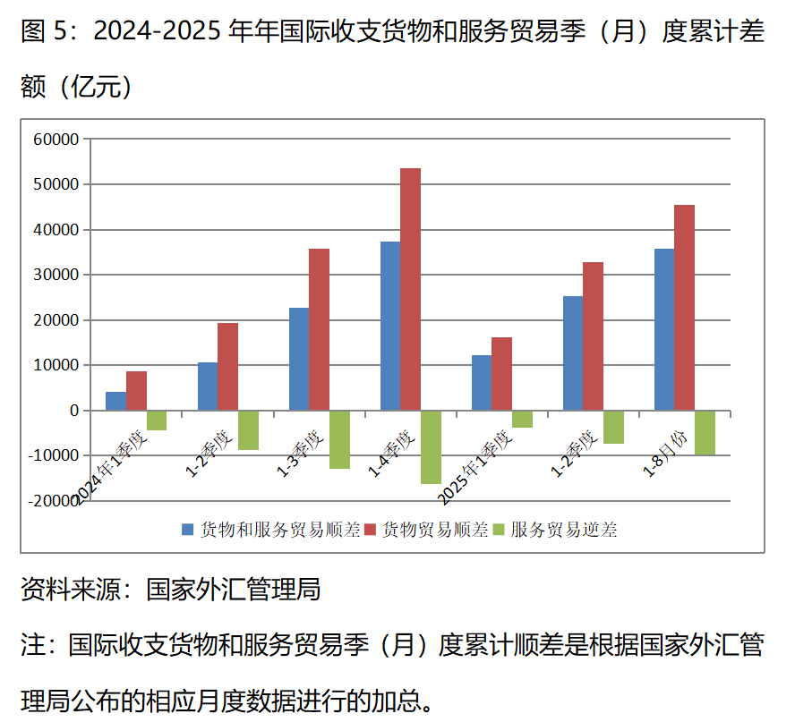 圖5:2024-2025年年國際收支貨物和服務(wù)貿(mào)易季(月)度累計(jì)差額(億元)