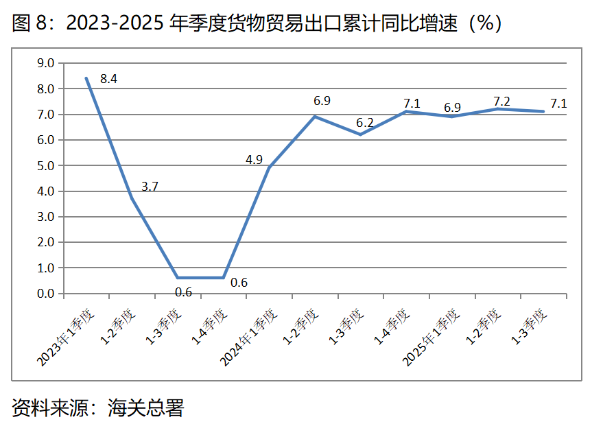 圖8:2023-2025年季度貨物貿(mào)易出口累計(jì)同比增速(%)