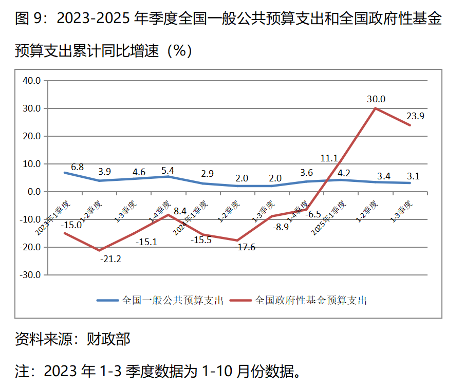 圖9:2023-2025年季度全國一般公共預(yù)算支出和全國政府性基金預(yù)算支出累計(jì)同比增速(%)
