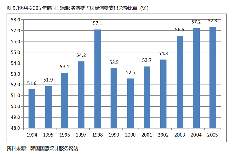 美國、日本和韓國在人均GDP超過1萬美元后,居民服務(wù)消費(fèi)占居民消費(fèi)支出總額比重的持續(xù)提高,居民耐用品消費(fèi)和非耐用品消費(fèi)占居民消費(fèi)支出總額比重的總體下降,給出的一個重要啟示,就是提高居民消費(fèi)率要聚焦在居民服務(wù)消費(fèi)上發(fā)力。
