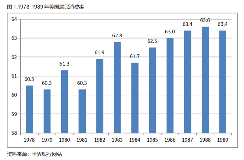 美國是1978年人均GDP超過1萬美元的,在1978-1989年的12年期間(選擇12個年份目的是與“十五五”時間跨度相對應(yīng),下同),居民消費(fèi)率雖然有波動,但總體是在高位上呈現(xiàn)出提高的走勢,1989年比1978年提高了2.9個百分點(diǎn)。